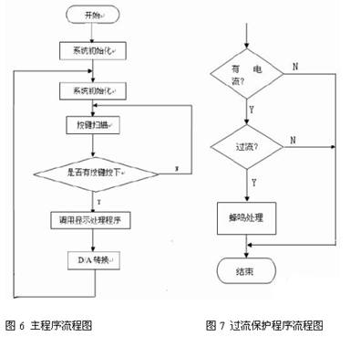 軟件控制程序由主程序和過流保護程序兩部分,其主要實現(xiàn)步進加減、D/A 轉換、鍵盤 掃描、LED 顯示、電流報警等功能。