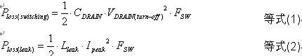 要滿足上述規(guī)范對外部電源工作能效及待機能耗的要求,我們首先需要分析清楚損耗的來源。事實上,就工作時的損耗來說,主要包括兩個方面,分別是開關(guān)損耗和由泄漏電感導(dǎo)致的損耗,這兩類損耗分別可以用等式(1)和等式(2)來量化: