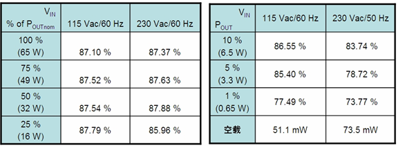 典型65 W筆記本適配器演示板能效測試結(jié)果