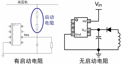 圖1:帶啟動電阻與不帶啟動電阻(內(nèi)置電壓啟動電流源)對比。