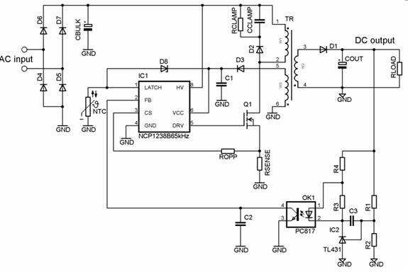 這系列控制器還采用輕載時頻率反走技術(shù)和跳周期模式,降低輕載時的開關(guān)頻率,從而提升能效;同時,開關(guān)頻率在25 kHz時鉗位,從而消除可聽噪聲。此外,這系列器件提供多種保護特性,如雙啟動電流電平、輸入欠壓及主電源過壓保護、過載保護、雙過渡保護閾值、軟啟動和閂鎖保護等。這系列器件還提供可選的動態(tài)自供電(DSS)功能,從而無需輔助繞組; 并內(nèi)置斜坡補償,不需要外部設(shè)定。以NCP1238為例,這器件的典型應(yīng)用電路圖如圖2所示。