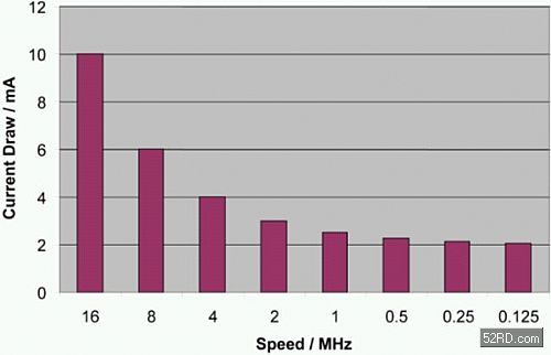 在淺層睡眠模式時中,時脈速度從16MHz降低至0.125MHz ,電流從 10mA降低至 2mA (如圖1所示)