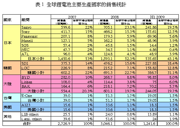 根據(jù)IIT2009年的統(tǒng)計預(yù)估,全球鋰電池芯銷售量約達30.5億顆,主要由日本的Sony、Sanyo、Panansonic、Maxell、SGS、NEC及ATL(被TDK購併),韓國的SDI(三星)及LGC(樂金化學),大陸的BYD(比亞迪)、BAK(比克)及Lishen(力神),臺灣的E-One(能元)及美國的A123所生產(chǎn),2007年到2009年銷售量統(tǒng)計如表一。