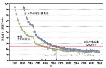 如同人們經(jīng)常指出的,太陽(yáng)能發(fā)電確實(shí)也有缺點(diǎn):下雨時(shí)輸出會(huì)很低,在陰天及其他情況時(shí)會(huì)有大幅波動(dòng),而且在夜晚時(shí)為零。然而,透過(guò)使用蓄電池后可以克服大部分的問(wèn)題。如果配有蓄電池的太陽(yáng)能發(fā)電系統(tǒng)達(dá)到與市電同價(jià)后,將會(huì)有很大的沖擊(其中包括減少石化燃料消耗)。日本經(jīng)濟(jì)產(chǎn)業(yè)研究所(RIETI)已預(yù)估大約2022年,配有蓄電池的家用太陽(yáng)能發(fā)電系統(tǒng)將達(dá)到與市電同價(jià)(圖10)。