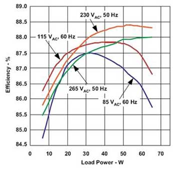 總之,更嚴格的節(jié)能標準要求創(chuàng)新的電源技術,電源需要在整個負載范圍內(nèi)都有很高的效率,并可極大節(jié)約能源?;谪撦d條件,操作不同模式下的使用準諧振控制和跳脈沖技術的反激式變換器可闡明它對AC/DC應用中的節(jié)能進行優(yōu)化的有效性。新開發(fā)的IC(如TI推出的UCC28600)是符合新節(jié)能標準的最優(yōu)解決方案之一。圖3提供了效率的典型測試結果,而圖4則顯示了在連接于通用離線輸入(帶單一18Vdc輸出)的65W反激式變換器中使用UCC28600的準諧振控制和跳脈沖技術的待機功率。