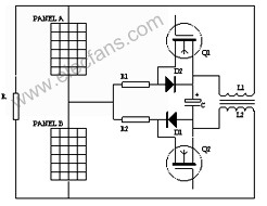 系統(tǒng)投入運行后,假設(shè)Ua>Ub,電壓環(huán)比例積分調(diào)節(jié)器的輸出高電平封鎖Q2的驅(qū)動電路,TL494的調(diào)制脈沖輸出端A(8腳)輸出PWM方波無效,只有Q1導(dǎo)通,功率從PANEL A流向PANELB,Ua下降,Ub上升,最終Ua=Ub。反之,Ua<Ub,電壓環(huán)比例積分調(diào)節(jié)器的輸出高電平封鎖Q1的驅(qū)動電路,TL494的調(diào)制脈沖輸出端B(11)腳輸出PWM方波無效,只有Q2導(dǎo)通,功率從PANELB流向PANELA,Ua上升,Ub下降,最終亦Ua=Ub。