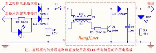 太陽能供電板的電路如圖1所示。由D1、BT構(gòu)成系統(tǒng)的太陽能充電電路。平時,只要達(dá)到一定光強(qiáng),太陽能電池板便通過二極管D1為充電電池BT充電,直至飽和。除了太陽能充電方式外,我還設(shè)計了備用的外部直流電源充電接口以防不時之需。外部充電電路由R1、DS1、D2、BT構(gòu)成,R1選用功率為1W的電阻,當(dāng)R1為10歐姆的時候,最佳外部充電電壓為3-4伏,DS1為外部充電指示燈,它是利用電阻R1上的壓降來點亮的。后面的升壓電路是運用間歇振蕩器的快速關(guān)斷(截止)的特性而實現(xiàn)升壓的。S1為供電開關(guān),當(dāng)S1閉合后升壓電路開始工作,太陽能供電板便可驅(qū)動負(fù)載,J1為輸出接口,DS2是輸出指示燈。