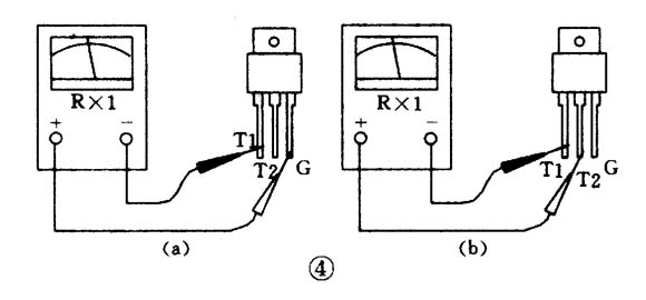 (2)把黑表筆接T1極,紅表筆接T2極,電阻為無窮大。接著用紅表筆尖把T2與G短路,給G極加上負(fù)觸發(fā)信號,電阻值應(yīng)為十歐左右(參見圖4(a)),證明管子已經(jīng)導(dǎo)通,導(dǎo)通方向為T1一T2。再將紅表筆尖與G極脫開(但仍接T2),若電阻值保持不變,證明管子在觸發(fā)之后能維持導(dǎo)通狀態(tài)(見圖4(b))。
