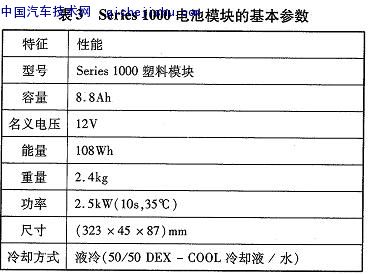 Cobasys是ChevronTexacoTechnologyVenture(美國第二大能源公司)和ECD(EnergyConversionDevices)的合資公司。ECD全資控股Ovonic,Ovonic擁有很多關于鎳氫電池方面的專利,全世界生產鎳氫電池的企業(yè)須得到它的許可才能生產銷售oCobasys不僅只是技術的研發(fā),而且把研發(fā)的技術推廣到產業(yè)化的水平。Cobasys專門為混合動力汽車開發(fā)8.8Ah的Series1000電池模塊。其基本參數見表3。