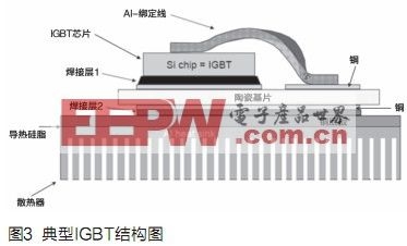 圖3顯示了帶基板的功率模塊的結(jié)構(gòu)。兩側(cè)都帶薄銅層的陶瓷襯底被焊接在基板上。IGBT芯片被焊在設(shè)計好的銅層上。芯片的表面通過綁定線(bondingwire)壓焊到銅層上。大多數(shù)標準模塊采用這種制作方法。目前70%到80%的功率模塊都按照標準模塊結(jié)構(gòu)來制造。陶瓷一般采用Al2O3,基板采用銅為材料。IGBT底板通過導(dǎo)熱硅脂安裝散熱器。