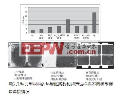 IGBT模塊由多層不同材料組成(見圖3),每種材料具有不同的CTE(熱膨脹系數(shù)),CTE的差別會影響功率模塊的使用壽命,當模塊使用時,溫度的變化會在不同層間產(chǎn)生機械應(yīng)力而導(dǎo)致焊接脫落,我們的目標是選用熱膨脹系數(shù)差別盡可能小的材料來進行焊接組合。但另一方面,即使它們的熱膨脹系數(shù)十分匹配,因為材料本身的成本可能會太高,或者在生產(chǎn)過程中難以被加工或加工成本太高。例如列車牽引應(yīng)用中的AlSiC基板。熱膨脹系數(shù)和襯底幾乎相同,因此有更好的熱循環(huán)特性。但對混合動力車應(yīng)用因成本過高而很難被接受。