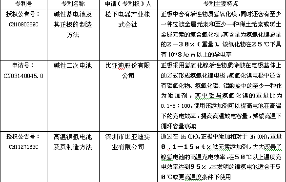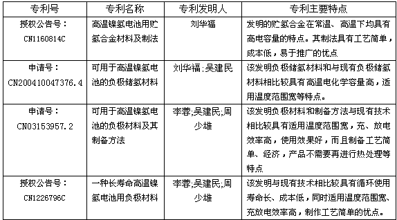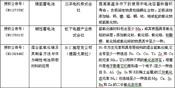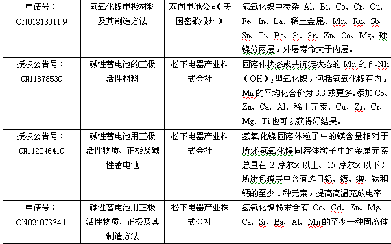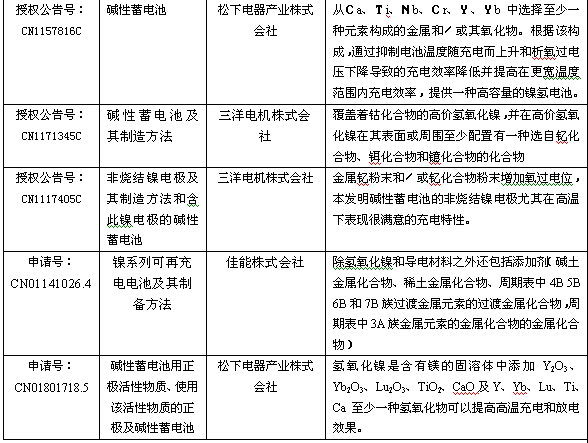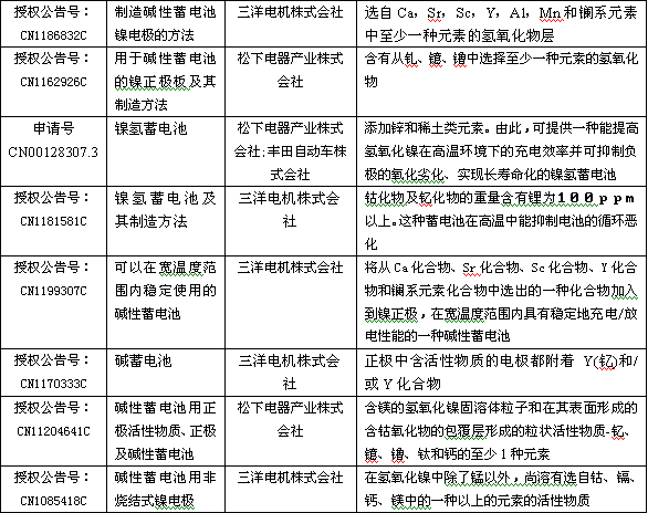 在電池配料時,通過機械混合法添加周期表中ⅡA、ⅢB、ⅣB、ⅦB、ⅧB、ⅡB主族元素和3、4、5周期的元素、氧化物或氫氧化物,能較好地提高或改善鎳氫高溫性能。世界著名電池制造公司在華申請授權(quán)的專利中多有介紹,如日本松下、三洋;中國比亞迪;德國H.C.施塔克等公司。詳細見下表: