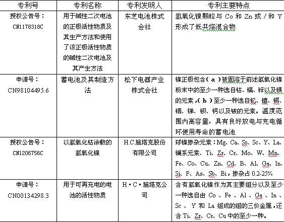 將上述元素在正極材料球形氫氧化鎳生產(chǎn)過程,采用摻雜到層狀結(jié)構(gòu)氫氧化化鎳中,取代部分鎳離子,形成固溶體,使元素之間均勻性更好;在球形氫氧化鎳外面包覆一層鈷的氫氧化物等,對于提高電池整體性能,均有改善功能。具有代表性的專利見下表: