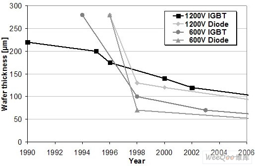 由于導(dǎo)通電壓和關(guān)斷損耗在很大程度上取決于晶圓的厚度,因此需要做更薄的IGBT。圖4顯示了英飛凌600/1,200VIGBT和EMCON二極管的晶圓厚度趨勢(shì)。對(duì)于新型1,200VRC-IGBT而言,120um厚度晶圓將是標(biāo)準(zhǔn)工藝。這需要進(jìn)行復(fù)雜的晶圓處理,包括用于正面和背面的特殊處理設(shè)備。將晶圓變薄可通過(guò)晶圓打磨和濕式化學(xué)蝕刻工藝實(shí)現(xiàn)。
