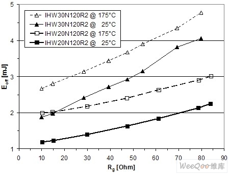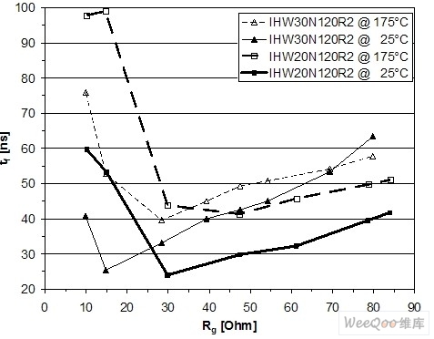 在典型飽和壓降Vce(sat)=1.6V@25℃/1.85V@175℃和典型正向電壓Vf=1.25V@175℃(額定電流)的條件下,功率損(特別是軟開關(guān)應(yīng)用的導(dǎo)通損耗)可大幅度降低。由IHW20N120R2的下降時(shí)間的切線可看出高速度—tf=24ns@25℃和Rg=30Ω(44ns@175℃)。IHW30120R2在下降時(shí)間方面是最為出色的:tf=33ns@25℃,Rg=30Ω;tf=40ns@175℃。(在硬開關(guān)條件下測(cè)量,參見帶有Eoff曲線的圖6和圖7)。[page]