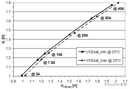 圖8:室溫和不同電流條件下IHW20N120R2的飽和壓降與Vf的關(guān)系