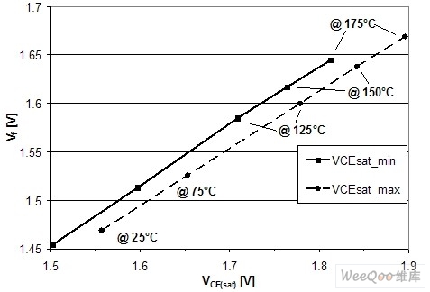 圖9:20A標(biāo)稱電流和不同溫度下IHW20N120R2的飽和壓降與Vf的關(guān)系