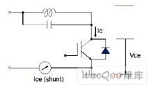 為了測(cè)量IGBT的集電極電流Ice,應(yīng)在發(fā)射極和地之間使用超低阻值的取樣電阻器。圖11為Vce和Ic的波形(搪瓷燒鍋負(fù)載)。工作頻率為29.1kHz,LC電路在諧振范圍之外(電磁爐的溫度模式為50℃)。