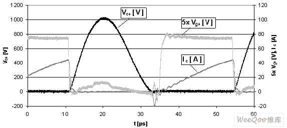 圖11:1.8kW電磁爐應(yīng)用(IHW20N120R2)的電壓諧振電路波形