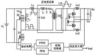 日本的研究人員開發(fā)成功一種振動(dòng)型壓電變壓器,其厚度僅為4mm。該壓電變壓器的驅(qū)動(dòng)電路采用方波逆變器,通過(guò)改變其開關(guān)頻率(PFM方式)以達(dá)到借助壓電變壓器的諧振特性來(lái)調(diào)整輸出電壓的目的。但是,由于壓電變壓器具有多種由其形狀所決定的諧振頻率,所以很難通過(guò)大幅度地改變頻率的做法來(lái)控制輸出電壓。為此,人們正在研究引入逆變器的脈寬調(diào)制(PWM)技術(shù)。圖7示出了通過(guò)將驅(qū)動(dòng)用逆變器、采用電流倍增器的整流電路以及采用PFM和PWM方式的混合控制電路與壓電變壓器相連而構(gòu)成的壓電變壓器DC/DC轉(zhuǎn)換器。
