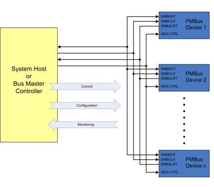 系統(tǒng)主機可以是安裝于印刷電路板(PCB)上作為電源管理總線裝置的實體裝置,如現(xiàn)場可編程門陣列(FPGA),微處理器或通用的微控制器,也可以是處于系統(tǒng)外部的控制實體,如自動檢驗設備,甚至可以是臺式電腦中的控制軟件。能夠用于系統(tǒng)管理總線通信的任何物體均可用作電源管理總線系統(tǒng)的界面。