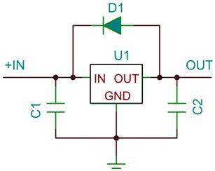 另一個動態(tài)性能變量是輸出噪聲。通過增加穩(wěn)壓器輸出端的濾波器電容一般可以降低輸入紋波和輸出噪聲,但是會延長瞬態(tài)恢復時間。線性穩(wěn)壓器的運行依賴于一個內(nèi)部增益級。為了防止該增益級出現(xiàn)振蕩,通常會需要一個最小輸出濾波器電容(請參見圖1中的C2)。一個輸入濾波器電容(請參見圖1中的C1)將有助于穩(wěn)壓器服務于瞬態(tài)負載,尤其是在穩(wěn)壓器遠離電源時更需要這樣一個輸入濾波器電容。許多穩(wěn)壓器都不容許存在反向電壓。如果輸出電容被充電至輸出電壓,同時輸入短路至接地,那么穩(wěn)壓器將出現(xiàn)反向電壓,并且在所有電路獲得放電以前穩(wěn)壓器都會鎖閉在某種未知狀態(tài)中。這種故障狀態(tài)可能會引起穩(wěn)壓器自毀。為了避免出現(xiàn)這種故障模式,可能會需要一個反向二極管鉗位(請參見圖3)。