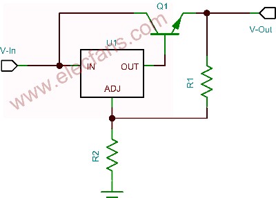 計算過程中輸入電流的使用,使得穩(wěn)壓器靜態(tài)或接地電流均得到考慮。在要求負載電流大于穩(wěn)壓器承受能力的情況下,可以添加一個外部晶體管,如圖4所示。這種做法僅適用于可調(diào)輸出穩(wěn)壓器。
