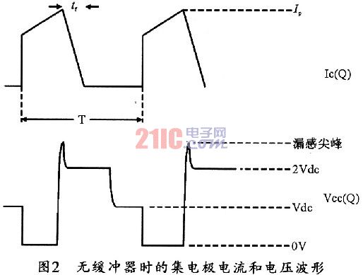 假設(shè)開(kāi)關(guān)管沒(méi)帶緩沖電路,圖1所示的正激變換器的復(fù)位繞組和初級(jí)繞組匝數(shù)相同。這樣,當(dāng)Q關(guān)斷瞬間,儲(chǔ)存在勵(lì)磁電感和漏感中的能量釋放,初級(jí)繞組兩端電壓極性反向,正激變換器的開(kāi)關(guān)管集電極電壓迅速上升到2Vdc。同時(shí),勵(lì)磁電流經(jīng)二極管D流向復(fù)位繞組,最后減小到零,此時(shí)Q兩端電壓下降到Vdc。圖2所示是開(kāi)關(guān)管集電極電流和電壓波形??梢?jiàn),開(kāi)關(guān)管不帶緩沖電路時(shí),在Q關(guān)斷時(shí),其兩端的漏感電壓尖峰很大,產(chǎn)生的關(guān)斷損耗也很大,嚴(yán)重時(shí)很可能會(huì)燒壞開(kāi)關(guān)管,因此,必須給開(kāi)關(guān)管加上緩沖電路。