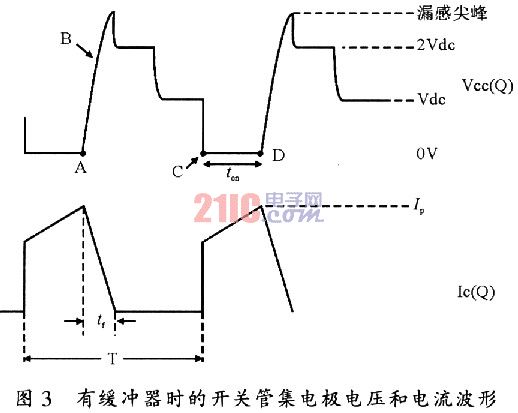 當(dāng)開(kāi)關(guān)管帶緩沖電路時(shí),其集電極電壓和電流波形如圖3所示(以正激變換器為例)。