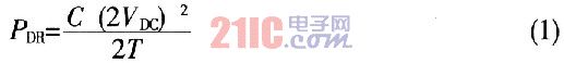 電容C的大小不僅影響集電極電壓的上升速度,而且決定了電阻R上的能量損耗。在Q關(guān)斷瞬間,C上的電壓為2Vdc,它儲(chǔ)存的能量為0.5C(2Vdc)2焦耳。如果該能量全部消耗在R上,則每周期內(nèi)消耗在R上的能量為: