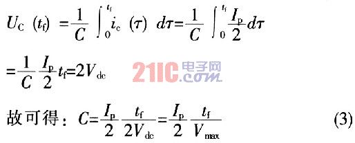 事實(shí)上,當(dāng)Q開(kāi)始關(guān)斷時(shí),假設(shè)最初的峰值電流Ip的一半流過(guò)C,另一半仍然流過(guò)逐漸關(guān)斷的Q集電極,同時(shí)假設(shè)變壓器中的漏感保持總電流仍然為Ip。那么,通過(guò)選擇合適的電容C,以使開(kāi)關(guān)管集電極電壓在時(shí)間tf內(nèi)上升到2Vdc(其中tf為集電極電流從初始值下降到零的時(shí)間,可以從開(kāi)關(guān)管數(shù)據(jù)手冊(cè)上查詢),則有: