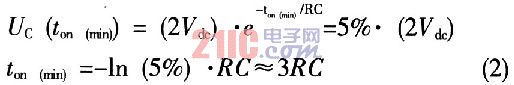 因此,從式(1)和式(3)便能計(jì)算出電容C的大小。在確定了C后,而最小導(dǎo)通時(shí)間已知,這樣,通過(guò)式(2)就可以得到電阻R的大小。