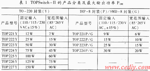 根據(jù)封裝形式,TOPSwitch-II可劃分成三種類型:TOP221Y~227Y(TO-220封裝),TOP221P~224P(DIP-8封裝),TOP221G~224G(SMD-8封裝),產(chǎn)品分類詳見(jiàn)表1。