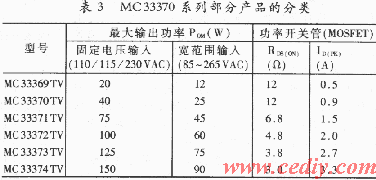 MC33370系列包括MC33369~MC33374五種規(guī)格、17種型號(hào)。以TO-220五腳直彎式封裝為例,其產(chǎn)品分類見(jiàn)表3。