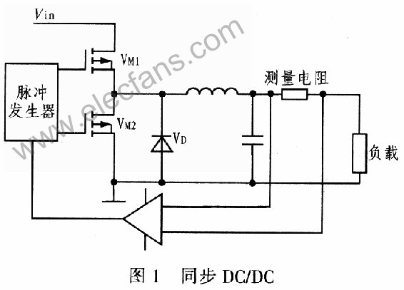 Vin為輸入電壓,VM1、VM2為MOSFET,VM1導(dǎo)通寬度決定輸出電壓大小,快恢復(fù)二極管和VM2共同續(xù)流電路,整流管的導(dǎo)通損耗占據(jù)最主要的部分,因此它的選擇至關(guān)重要,試驗(yàn)中選用通態(tài)電阻很低的M0SFET。電感、電容組成濾波電路。測(cè)量電阻兩端電壓與給定值比較后,通過脈沖發(fā)生器產(chǎn)生相應(yīng)的脈寬,保持負(fù)載電流穩(wěn)定。VM1關(guān)斷,快恢復(fù)二極管工作,快恢復(fù)二極管通態(tài)損耗大,VM2接著開通續(xù)流,減少系統(tǒng)損耗。