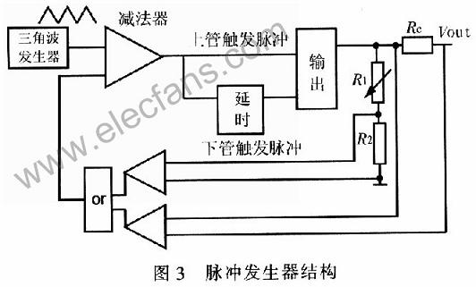 系統(tǒng)采用了電流負(fù)反饋電路,以適應(yīng)激光二極管的要求。當(dāng)負(fù)載變化,電流略大于給定電流時(shí),減小ton寬度,電壓降低。電流略小于給定電流時(shí),增加ton寬度,這樣可以維持電流穩(wěn)定。圖3所示為脈沖發(fā)生器結(jié)構(gòu)。
