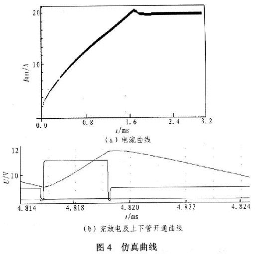 圖3中,R1,R2為電壓測(cè)量電阻,Rc為電流測(cè)量電阻。調(diào)節(jié)R1可以設(shè)定最大輸出電壓。Rc限制最大輸出電流。當(dāng)最大電壓或電流其中一個(gè)達(dá)到給定值,則脈沖寬度最大。這樣可以保證負(fù)載正常工作。