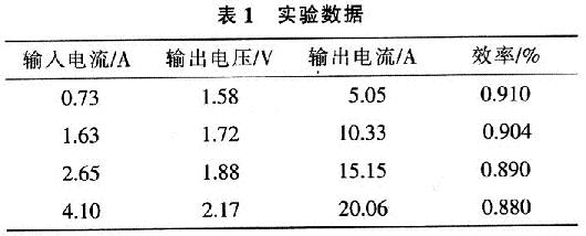 實(shí)驗(yàn)中用50A的2個(gè)二極管串聯(lián)作為負(fù)載,輸入電壓12V時(shí),不同電流下輸出及效率如表1所示。