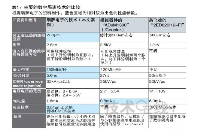 美國(guó)模擬器件(ADI)、美國(guó)芯科實(shí)驗(yàn)室(Silicon Laboratories)以及德國(guó)英飛凌科技(Infineon Technologies)等已經(jīng)使采用片上變壓器的隔離器實(shí)現(xiàn)了實(shí)用化。此次技術(shù)與這些現(xiàn)有技術(shù)的不同之處在于,考慮到要集成在廉價(jià)的微控制器上,將變壓器的面積減小到了原來的1/4左右。具體情況是,通過電路技術(shù)的改進(jìn),將原來需要500μm左右的變壓器直徑降至230μm(表1)。