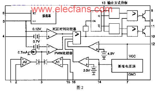 死區(qū)時(shí)間由4腳電壓來設(shè)定,范圍為0~3.3V之間。誤差放大器A1作為輸出電壓取樣誤差放大,結(jié)果通過PWM比較器控制脈寬使輸出電壓穩(wěn)定。誤差放大器A2作為保護(hù)控制用,15腳接參考電壓5V(由14腳提供),16腳為控制輸入。在開機(jī)保護(hù)、過溫或過流保護(hù)時(shí),16腳為高電平,這時(shí),誤差放大器A2輸出高電平,該電平高于振蕩器三角波電平幅值,而使驅(qū)動(dòng)器沒有驅(qū)動(dòng)脈沖輸出,負(fù)載安全停電。