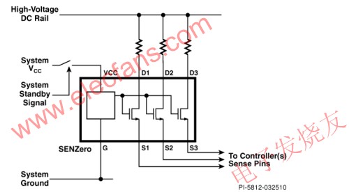 在消除市電輸入的電流消耗之后,接下來需要消除電路中的那些即使在待機(jī)狀態(tài)下也會(huì)連續(xù)消耗功率的其他元件的電流消耗。在較高功率應(yīng)用中,在高壓母線與功率因數(shù)校正(PFC)和DC/DC轉(zhuǎn)換器的電源控制器之間可能存在多條信號(hào)通路。例如包括PFC系統(tǒng)中連接升壓控制器的前饋或反饋信號(hào)通路,以及雙開關(guān)正向/LLC/半橋和全橋轉(zhuǎn)換器中的前饋信號(hào)通路。PI的第二款新產(chǎn)品是SENZero,它可以在不需要這些信號(hào)通路時(shí)將它們隔離,從而消除不必要的功率損耗。SENZero的典型應(yīng)用如圖4所示。