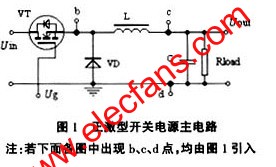 一般來講,正激型開關電源主電路可用圖1所示的降壓斬波器簡化表示,Ug表示控制電路的PWM輸出驅動信號。根據(jù)選用不同的PWM反饋控制模式,電路中的輸入電壓Uin、輸出電壓Uout、開關器件電流(由b點引出)、電感電流(由c點引出或d點引出)均可作為取樣控制信號。