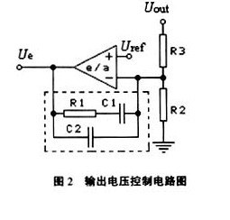 輸出電壓Uout在作為控制取樣信號時,通常經過圖2所示的電路進行處理,得到電壓信號Ue,Ue再經處理或直接送入PWM控制器。圖2中電壓運算放大器(e/a)的作用有三: