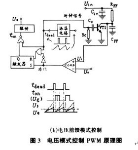 改善加快電壓模式控制瞬態(tài)響應速度的方法有二種:一是增加電壓誤差放大器的帶寬,保證具有一定的高頻增益。但是這樣容易受高頻開關噪聲干擾影響,需要在主電路及反饋控制電路上采取措施進行抑制或同相位衰減平滑處理;另一方法是采用電壓前饋模式控制PWM技術,原理如圖3(b)所示。用輸入電壓對電阻電容(RFF、CFF)充電產生的具有可變化上斜坡的三角波取代傳統(tǒng)電壓模式控制PWM中振蕩器產生的固定三角波。此時輸入電壓變化能立刻在脈沖寬度的變化上反映出來,因此該方法對輸入電壓的變化引起的瞬態(tài)響應速度明顯提高。對輸入電壓的前饋控制是開環(huán)控制,而對輸出電壓的控制是閉環(huán)控制,目的是增加對輸入電壓變化的動態(tài)響應速度。這是一個有開環(huán)和閉環(huán)構成的雙環(huán)控制系統(tǒng)。