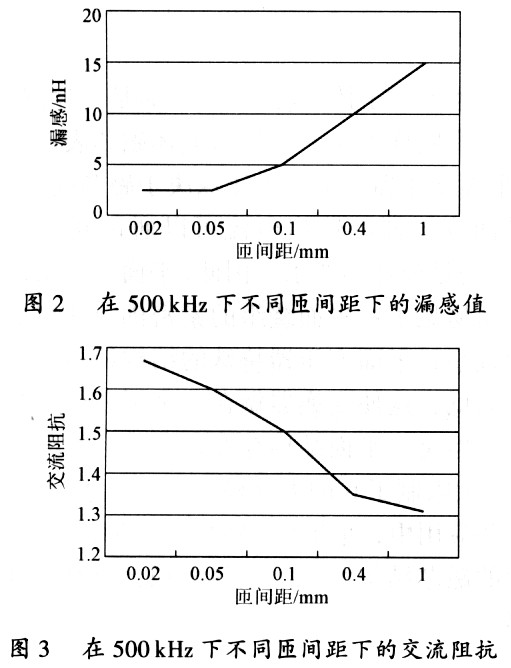 圖2與圖3給出了在不同的間隙下漏感和交流阻抗的變化,可以明顯地看出間隙越大,漏感越大,交流阻抗越小。在間隙增加1mm的狀況下漏感值增加了5倍之多。因此,在滿足電氣絕緣的情況下,應(yīng)該選用最薄的絕緣體來獲得最小的漏感值。