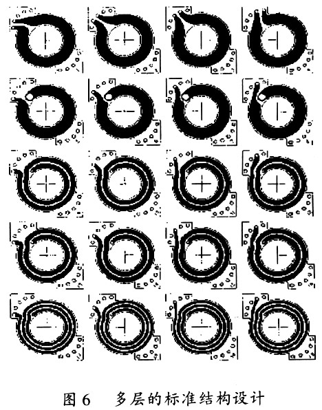 在雙面PCB板的每一層都是由一到多匝的繞組組成的,而且所有的層都保持著一樣的物理特性:即相同的形狀和相同的外部連接點。在有些多匝的層次中,這個外部連接點是不同匝數(shù)間的電氣連接點。如果有些層只有一匝,它也可以被印制在PCB的雙面來降低交流阻抗。使用銅箔直接印制在PCB板上來替代傳統(tǒng)的導(dǎo)線,即使在許多需要很多匝數(shù)的開關(guān)電源中,變壓器依舊能保持一個很小的體積,這便大大減小了整機(jī)的體積。具體的設(shè)計步奏和注意事項請參閱文獻(xiàn)[3]。圖6顯示了一個頂層的標(biāo)準(zhǔn)匝數(shù)設(shè)計的例子,它使用的是罐形(RM)磁芯。