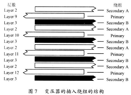 插入技術(shù)是指在布置變壓器原、副邊繞組時,使原邊繞組與副邊繞組交替放置,增加原、副邊繞組的耦合以減小漏感,同時使得電流平均分布,減小變壓器損耗。