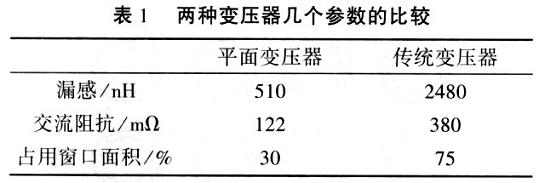 兩種變壓器都使用了同樣的磁芯RM10,比較了兩種變壓器的漏感,交流阻抗和占用的面積,結(jié)果列于表1。
