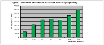 圖4所示為iSuppli公司對2009-2015年總體PV安裝量的估計與預(yù)測。