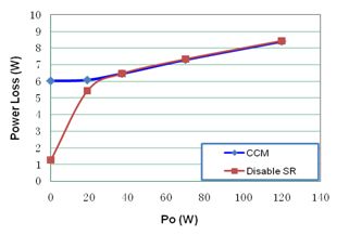 通過(guò)ADP1043的GUI可以設(shè)置關(guān)閉同步整流時(shí)的電流閾值。當(dāng)輸出電流值低于該閾值時(shí),關(guān)閉同步整流。如圖6所示為采用ADP1043設(shè)計(jì)的全橋拓?fù)涞哪K電源在不關(guān)閉和關(guān)閉同步整流在輕載條件下的損耗的情況??梢钥吹剑?dāng)關(guān)閉同步整流后,大大減少了電源的輕載損耗。